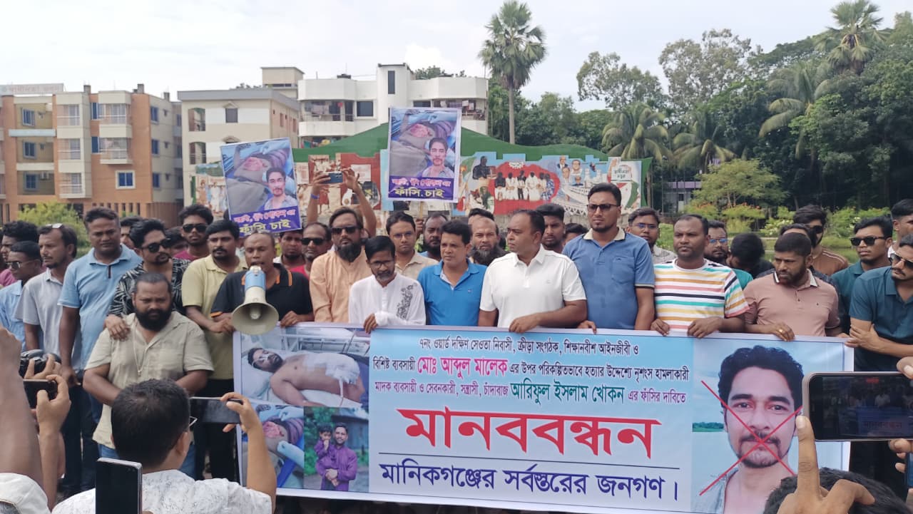 মানিকগঞ্জে শিক্ষানবিশ আইনজীবী মালেকের ওপর হামলাকারী ফাঁসির দাবিতে মানববন্ধন।