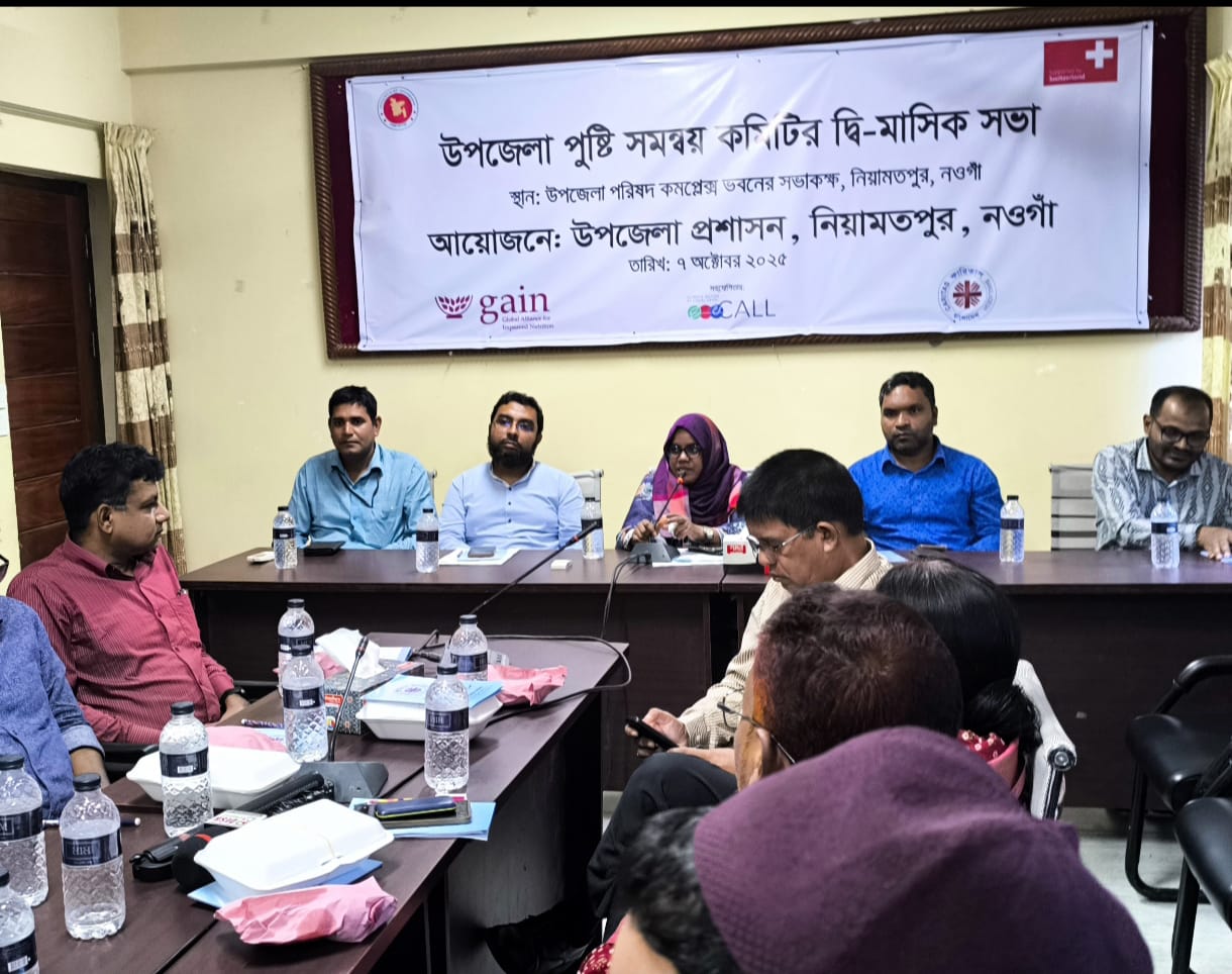 নওগাঁর নিয়ামতপুরে পুষ্টি সমন্বয় কমিটির দ্বি-মাসিক সভা অনুষ্ঠিত হয়েছে। উপজেলা স্বাস্থ্য কমপ্লেক্সের আয়োজনে এবং কারিতাস বাংলাদেশ, রাজশাহী অঞ্চল ও গেইন বাংলাদেশ এর সহযোগিতায় গতকাল বেলা ১১ টায় উপজেলা নির্বাহী অফিসারের সভাকক্ষে নিয়ামতপুর উপজেলা নির্বাহী অফিসার মুর্শিদা খাতুন এর সভাপতিত্বে শুভেচ্ছা বক্তব্য প্রদান করেন, উপজেলা স্বাস্থ্য ও পরিবার পরিকল্পনা কর্মকর্তা ও পুষ্টি কমিটির সদস্য সচিব ডা.ফয়সাল নাহিদ পবিত্র। এছাড়াও মাল্টি স্টেকহোল্ডার প্লাটফর্ম বিষয়ক প্রতিবেদন উপস্থাপন করেন ড. মনির হোসেন গেইন বাংলাদেশ প্রতিনিধি ঢাকা, মো. আবুল বাশার প্রকল্প ম্যানেজার কারিতাস রাজশাহী অঞ্চল, মো. বাবুলাল তির্কী , উপজেলা অফিসার কারিতাস (কল)। এসময় পুষ্টি বিষয়ে গুরুত্বপূর্ণ বক্তব্য প্রদান করেন উপজেলা কৃষি কর্মকর্তা রফিকুল ইসলাম , প্রাণিসম্পদ কর্মকর্তা ডা.আব্দুল লতিফ, নিয়ামতপুর সরকারি কলেজের প্রভাষক ও নিয়ামতপুর স্কুলের শিক্ষকগণ , ইউনিয়ন পরিষদের প্যানেল চেয়ারম্যানসহ প্রমূখ ব্যক্তিবর্গ ।