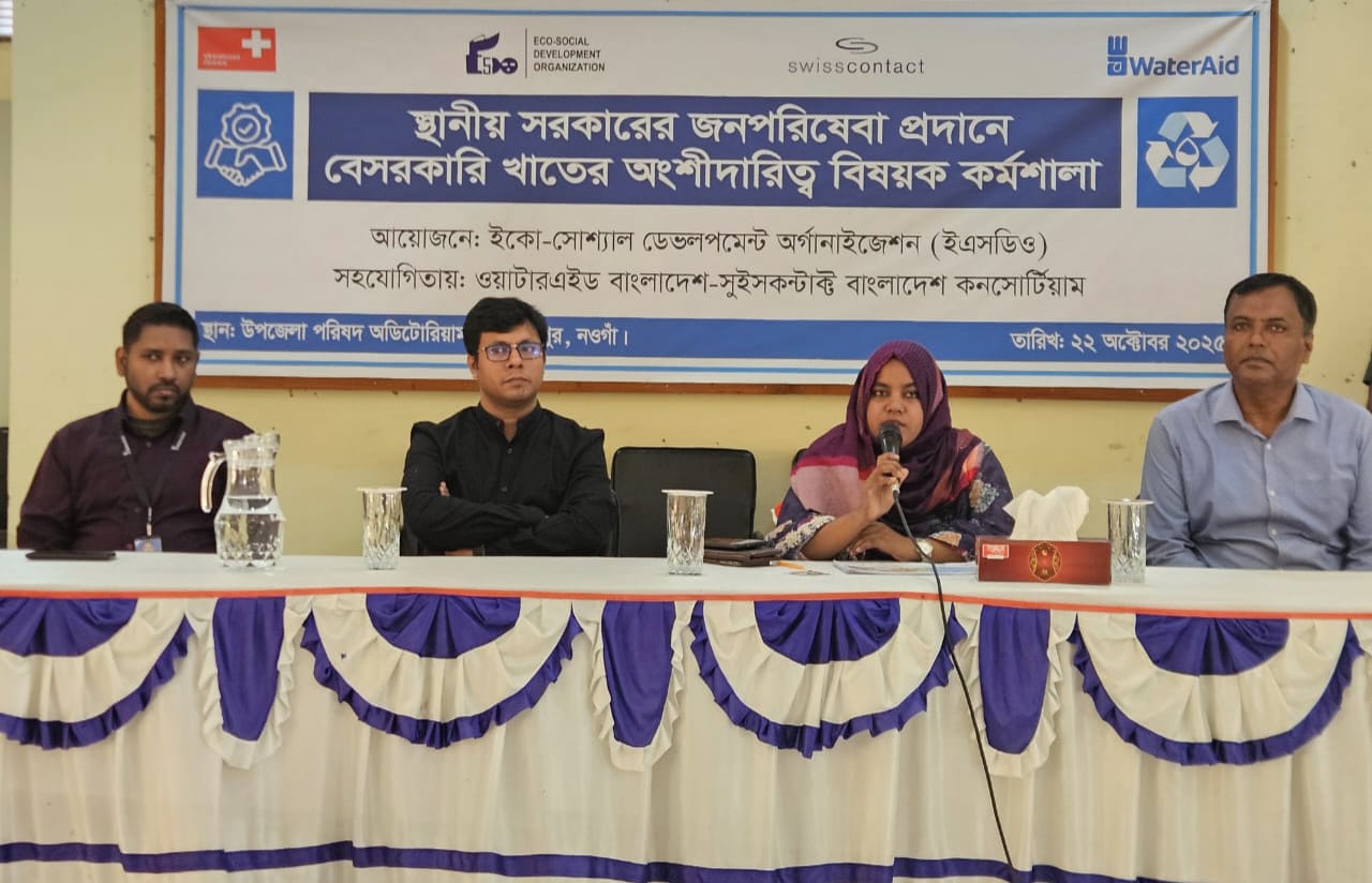 অদ্য ২২ অক্টোবর ২০২৫ ইং তারিখ বুধবার সকাল ১০:০০ টায় ইকো-সোশ্যাল ডেভলপমেন্ট অর্গানাইজেশন (ইএসডিও)’র গোফরইমপ্যাক্ট কর্মসূচির আয়োজনে, সুইজারল্যান্ড সরকারের অর্থায়নে এবং ওয়াটারএইড বাংলাদেশ ও সুইসকন্টাক্ট বাংলাদেশের সহযোগিতায় নিয়ামতপুর উপজেলা পরিষদ অডিটোরিয়ামে এই কর্মশালা অনুষ্ঠিত হয়। এই কর্মশালার মূল উদ্দেশ্য স্থানীয় সরকার প্রতিষ্ঠানসমূহ ও বেসরকারী উদ্যোক্তাদের মধ্যে পারস্পারিক বোঝাপড়া আস্থা ও অংশীদারিত্ব বৃদ্ধি এবং বিদ্যমান নীতিগত ও বাস্তব চ্যালেঞ্জগুলো চিহ্নিত করে সম্মিলিতভাবে এসব চ্যালেঞ্জের সমাধান খুজে বের করা।