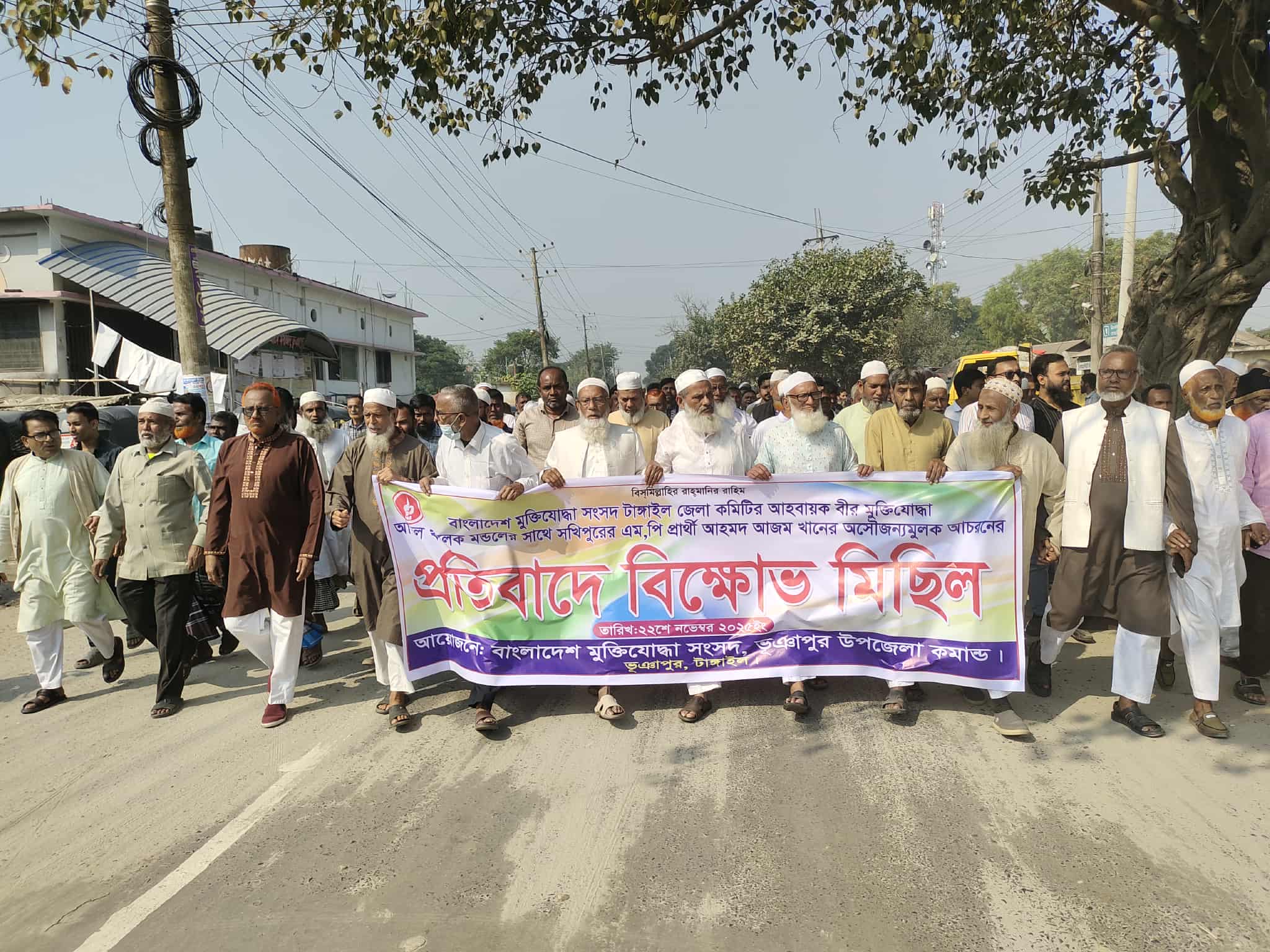 বাংলাদেশ মুক্তিযোদ্ধা সংসদ টাঙ্গাইল জেলা কমিটির আহ্বায়ক বীর মুক্তিযোদ্ধা এডভোকেট আব্দুল খালেক মন্ডলের সাথে সখিপুর-বাসাইল আসনের বিএনপি’র এমপি প্রার্থী আহমদ আজম খানের অসৌজন্যমূলক আচরণের প্রতিবাদে বিক্ষোভ মিছিল ও সমাবেশ করেছে বাংলাদেশ মুক্তিযোদ্ধা সংসদ ভূঞাপুর উপজেলা শাখা। শনিবার (২২ নভেম্বর) সকালে বাংলাদেশ মুক্তিযোদ্ধা সংসদ ভূঞাপুর উপজেলা শাখার উদ্যোগে এই বিক্ষোভ মিছিল ও সমাবেশ অনুষ্ঠিত হয়। প্রথমে মিছিলটি ভূঞাপুর মুক্তিযোদ্ধা সংসদের সামনে থেকে বের হয়ে পৌর শহরের বিভিন্ন সড়ক প্রদক্ষিণ শেষে উপজেলা চত্বরে এক সমাবেশ অনুষ্ঠিত হয়।