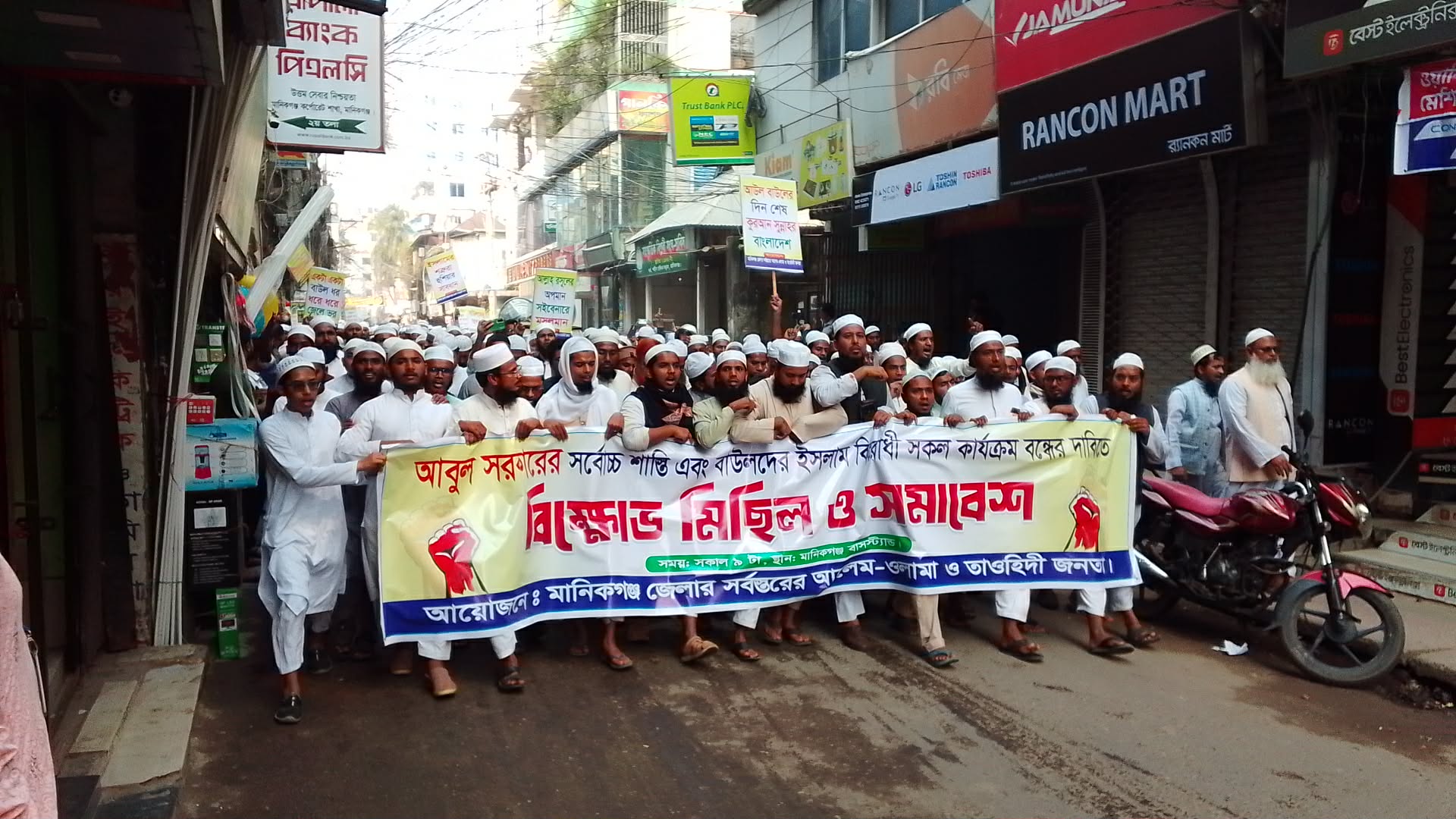 রবিবার (২৩ নভেম্বর) সকাল ৯টায় মানিকগঞ্জ জেলা বাসস্ট্যান্ড এলাকায় সর্বস্তরের আলেম-ওলামা ও তাওহিদী জনতার ব্যানারে সমাবেশ শুরু হয়।