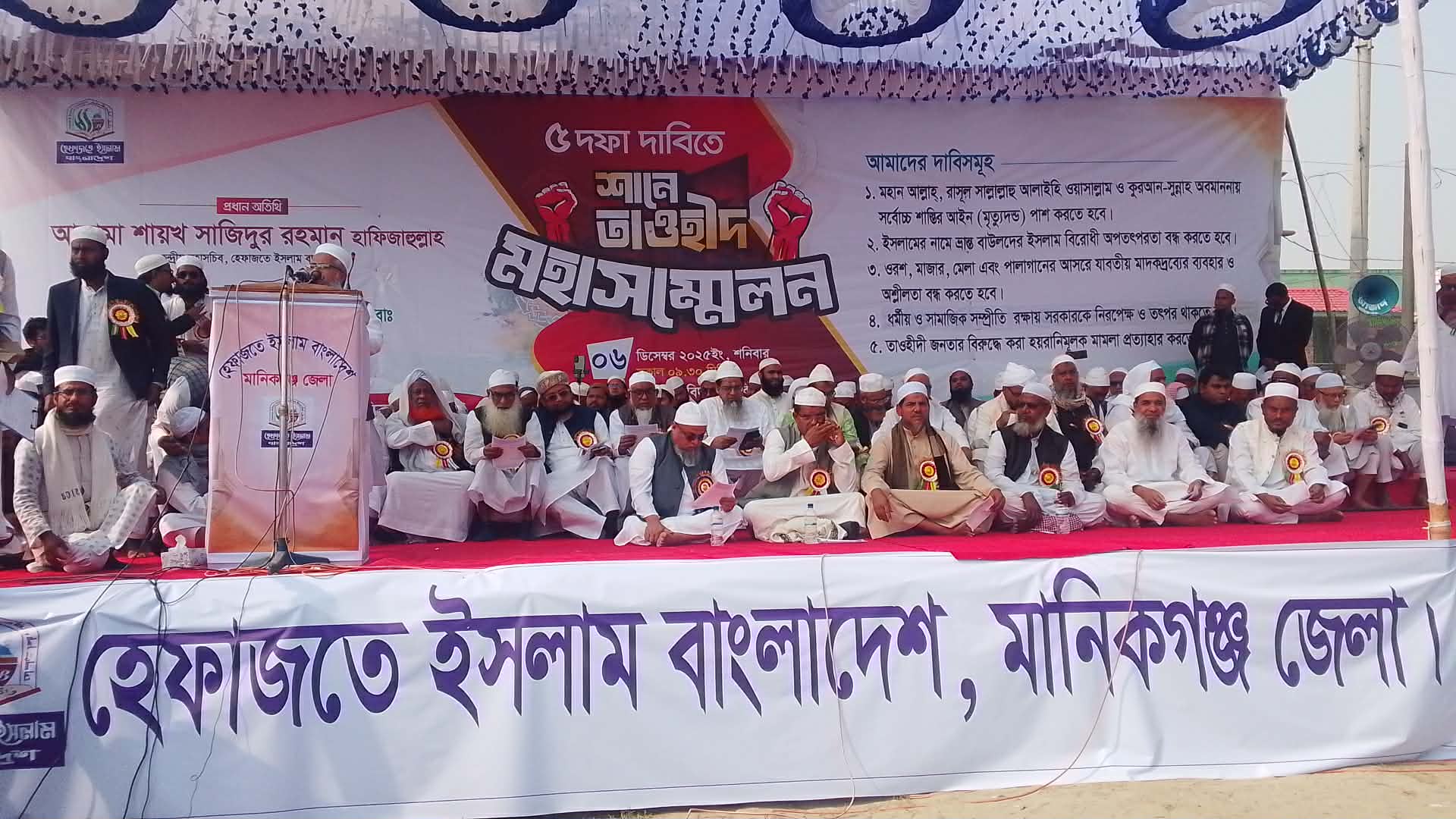 মানিকগঞ্জে হেফাজতে ইসলাম জেলা শাখার উদ্যোগে অনুষ্ঠিত হলো “শানে তাওহীদ মহা সম্মেলন”— যেখানে ধর্মীয় অনুভূতি ও ইসলামবিরোধী কর্মকাণ্ডের অভিযোগে বাউল শিল্পী আবুল সরকারের বিরুদ্ধে সর্বোচ্চ শাস্তি নিশ্চিতসহ ৫ দফা দাবি তুলে ধরেন আলেম-ওলামারা।
