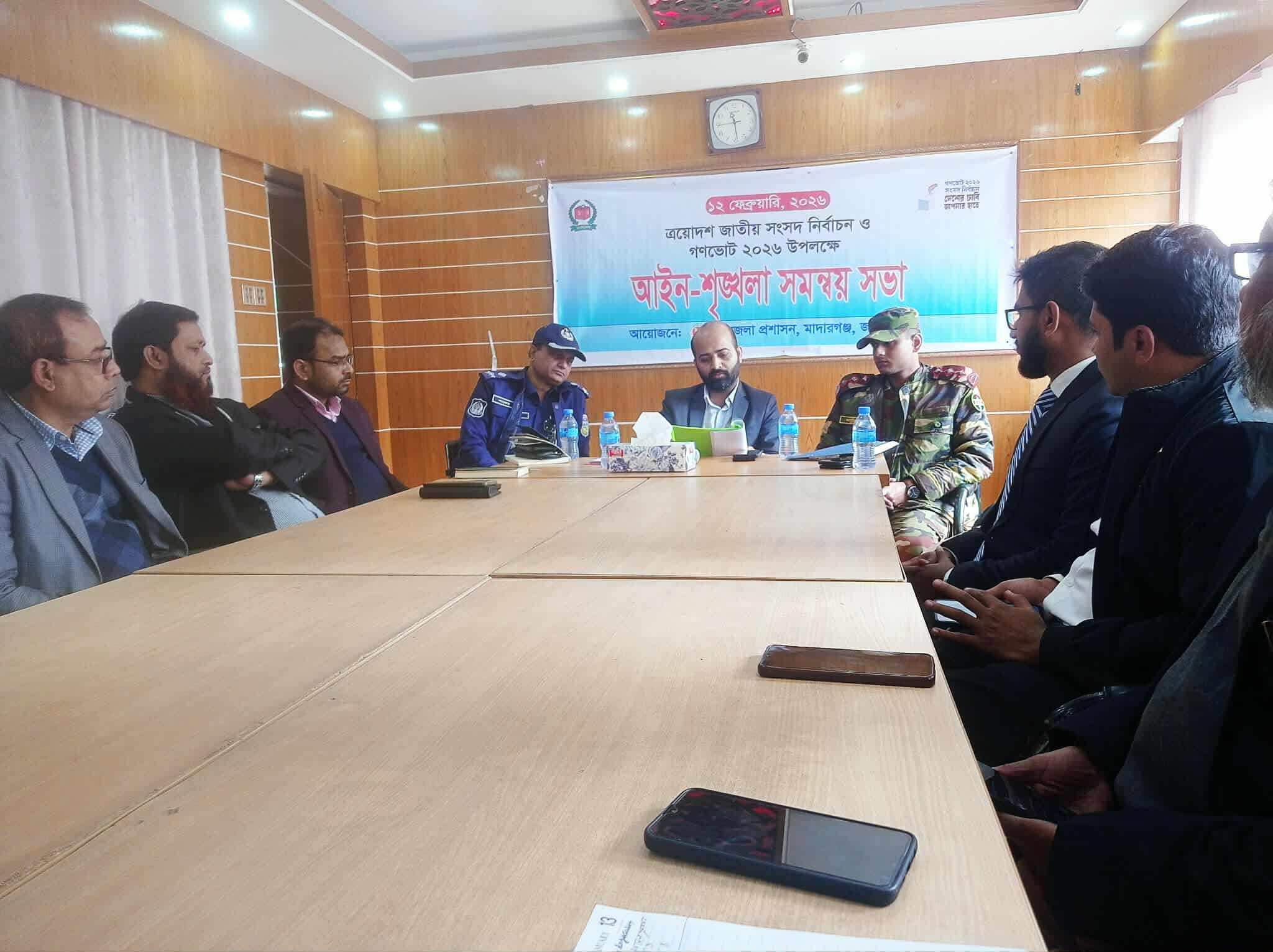 ১২ ফেব্রুয়ারি-২০২৬ ত্রয়োদশ জাতীয় সংসদ নির্বাচন ও গণ ভোট -২০২৬ উপলক্ষে জামালপুরের মাদারগঞ্জে আইনশৃঙ্খলা সমন্বয় সভা অনুষ্ঠিত হয়েছে।