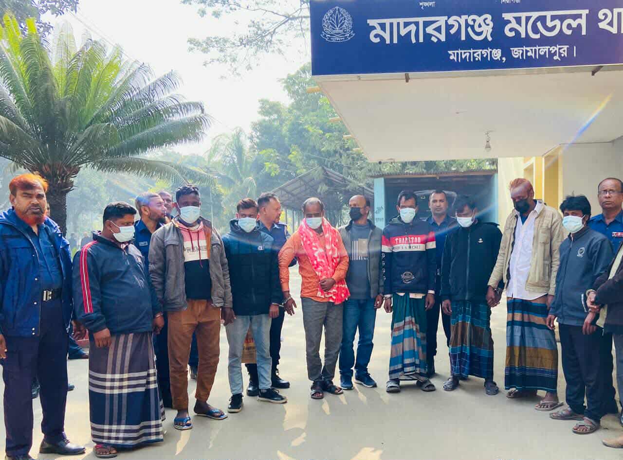 জামালপুরের মাদারগঞ্জে ৯ জুয়াড়ি কে আটক করেছে পুলিশ। মঙ্গলবার সন্ধায় গোপন সংবাদের ভিত্তিতে বালিজুড়ী ইউনিয়নের শুভগাছা এলাকা থেকে জুয়া খেলা অবস্থায় আটক করে পুলিশ। আটককৃতরা হলেন মাদারগঞ্জের গাবের গ্রামের সুজন খান (৪২) , সোহেল মন্ডল (৪০), মজনু খান (৪৭), পশ্চিম সুখনগরী এলাকার নূর মোহাম্মদ (২৫) ও সাইদুল মন্ডল (৪২), বালিজুড়ী এলাকার শুক্কুর আলী ফকির, ইসলামপুরের সামিউল (৪৫), মেলান্দহ উপজেলার ঘোষেরপাড়ার বিদ্যুৎ আকন্দ (৩৫), সারিয়াকান্দি উপজেলার উত্তর টেংরাকুড়ার হাফিজুর রহমান (৩৫), তাদের কাছ থেকে নগদ ৭১ হাজার পাঁচশত পঞ্চাশ টাকা, ৭ বান্ডিল তাস এবং ৩ টি মোটরসাইকেল জব্দ করা হয়। বুধবার বেলা ১২ টায় আটকৃত আসামীদের জামালপুর বিজ্ঞ আদালতে পাঠানো হয়েছে।