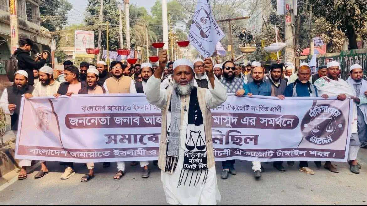 টাঙ্গাইল সদর-৫ আসনে জামায়াত প্রার্থীর পক্ষে সমাবেশ ও মিছিল।