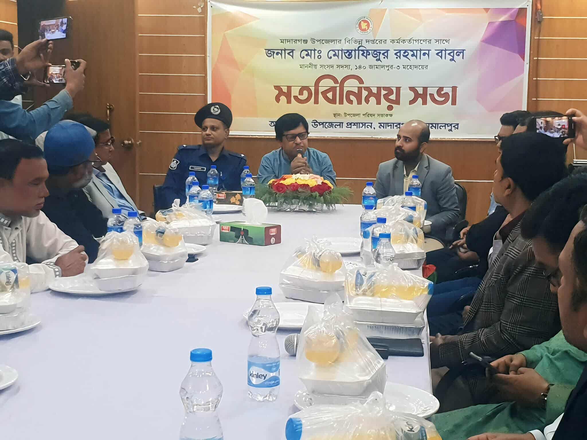 জামালপুরের মাদারগঞ্জে বিভিন্ন দপ্তরের কর্মকর্তাগণের সাথে নবনির্বাচিত এমপি বাবুল এর মতবিনিময় সভা অনুষ্ঠিত হয়েছে। রোববার বিকাল ৫ টায় উপজেলা পরিষদ সভাকক্ষে উপজেলা প্রশাসন আয়োজিত এ মতবিনিময় সভা অনুষ্ঠিত হয়। প্রধান অতিথি হিসেবে উপস্থিত ছিলেন জামালপুর-৩ আসনের নবনির্বাচিত সংসদ সদস্য মোস্তাফিজুর রহমান বাবুল।