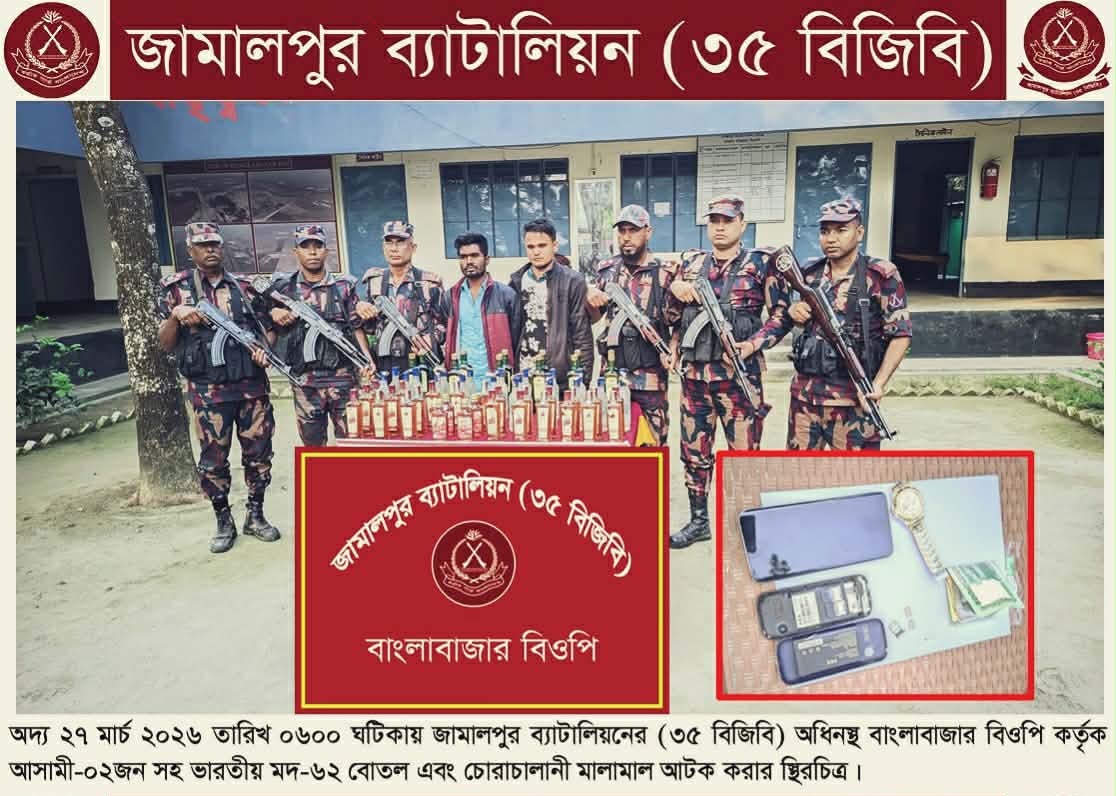 কুড়িগ্রামের রৌমারী সীমান্ত এলাকায় অভিযান চালিয়ে ভারতীয় অবৈধ বিভিন্ন ব্র্যান্ডের মদসহ দু”জনকে আটক করেছে বাংলাদেশ বর্ডার গার্ড (৩৫ বিজিবি)।শুক্রবার (২৭ মার্চ) ভোর আনুমানিক ৬টার দিকে বাংলা বাজার বিওপির এসআইপি সদস্যরা গোপন সংবাদের ভিত্তিতে নিয়মিত টহল চলাকালে অভিযান পরিচালনা করে দু”জনকে আটক করা হয় । ভারতীয় মেইন পিলার ১০৬৫/২এস থেকে প্রায় ৬০০ গজ বাংলাদেশের অভ্যন্তরে ফুলবাড়ি এলাকায় অভিযানটি পরিচালিত হয়।