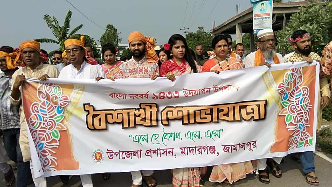 এসো হে বৈশাখ এসো এসো এ স্লোগানে বাংলা নববর্ষ-১৪৩৩ উদযাপন উপলক্ষে জামালপুরের মাদারগঞ্জে বর্ণাঢ্য র্যালী, আলোচনা সভা ও সাংস্কৃতিক অনুষ্ঠান অনুষ্ঠিত হয়েছে।
