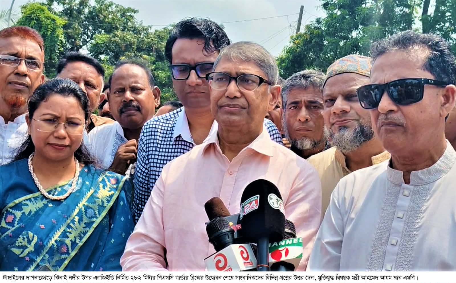 মুক্তিযুদ্ধ বিষয়ক মন্ত্রী অ্যাডভোকেট আহমেদ আযম খান এমপি বলেছেন, সরকার একেবারে শূন্য হাতে উন্নয়ন শুরু করেছে। সরকারের তহবিলে পর্যাপ্ত টাকা নেই। তারপরও আমরা উন্নয়ন কর্মকান্ড শুরু করেছি। অতিগুরুত্বপূর্ণ ভাতকুড়া থেকে নলুয়া পর্যন্ত ফোরলেন সড়কের বিষয়টি আমার নির্বাচনি প্রতিশ্রুতি। আমি এটা নিয়ে কাজ শুরু করে দিয়েছি। অচিরেই ভাতকুড়া থেকে নলুয়া পর্যন্ত ফোরলেন সড়কের কাজ শুরু হবে ইনশাল্লাহ। শনিবার(১৮ এপ্রিল) দুপুরে টাঙ্গাইলের বাসাইল উপজেলার দাপনাজোড়ে ঝিনাই(পুংলি) নদীর উপর এলজিইডি নির্মিত ২৮২ মিটার পিএসসি গার্ডার ব্রিজের উদ্বোধন শেষে সাংবাদিকদের বিভিন্ন প্রশ্নের জবাবে তিনি এসব কথা বলেন। উদ্বোধন শেষে মন্ত্রী দৃষ্টিনন্দন সেতুটি ঘুরে ঘুরে দেখেন এবং স্থানীয় গণমানুষের সঙ্গে কথা বলেন।